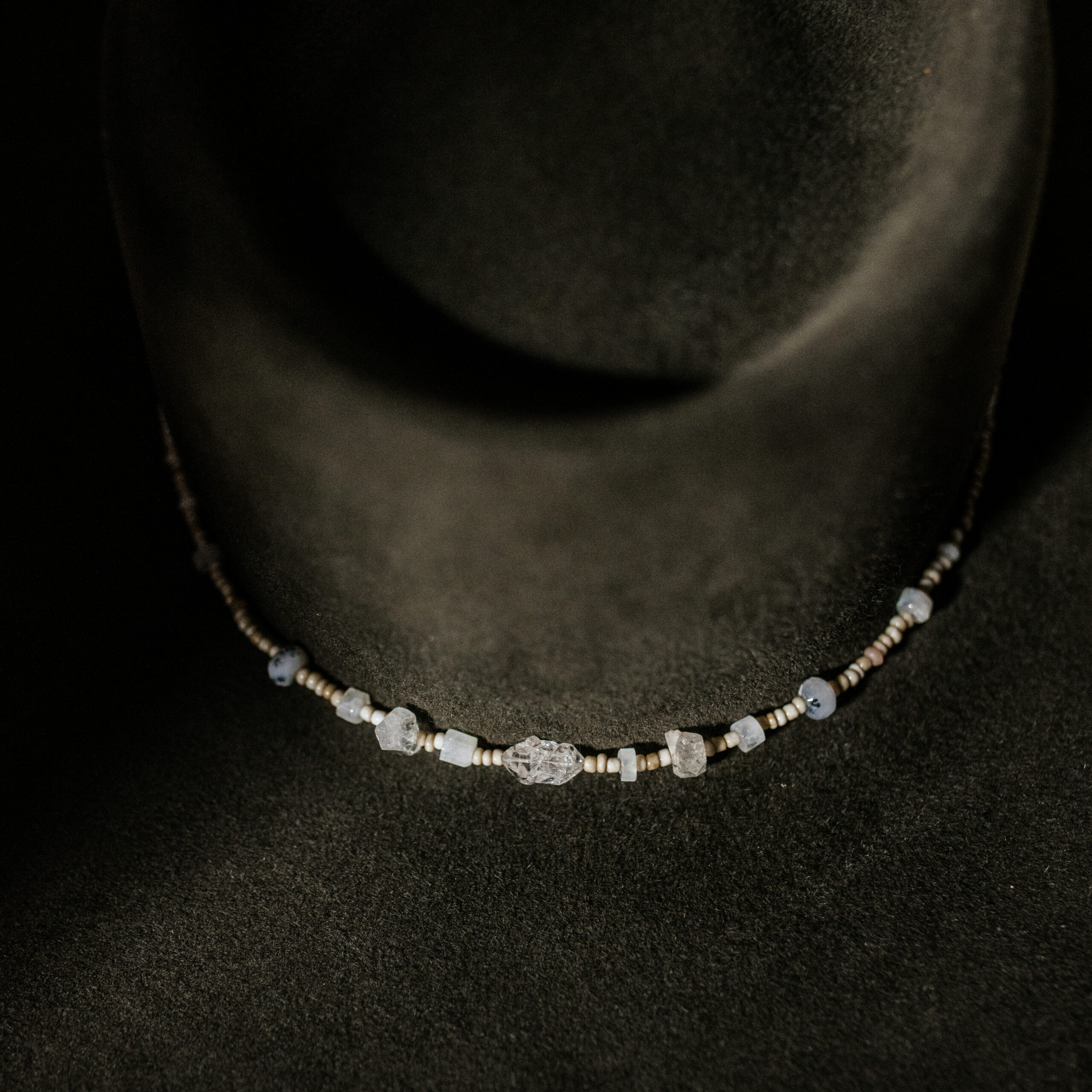 Crown of the Vagabond Hat on Mallorca in color Tortuga Oasis-shaped. Crystal thread in the front held together by satin string.