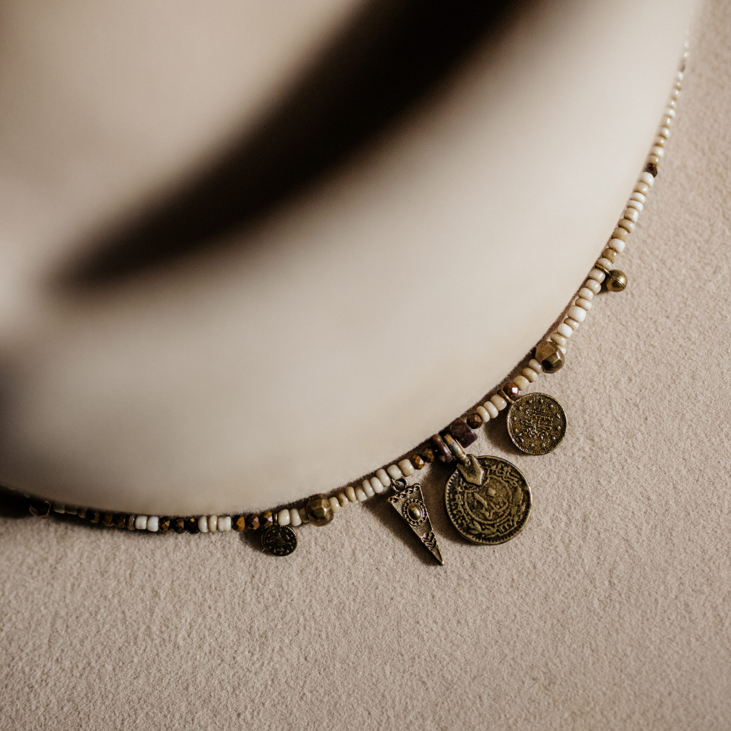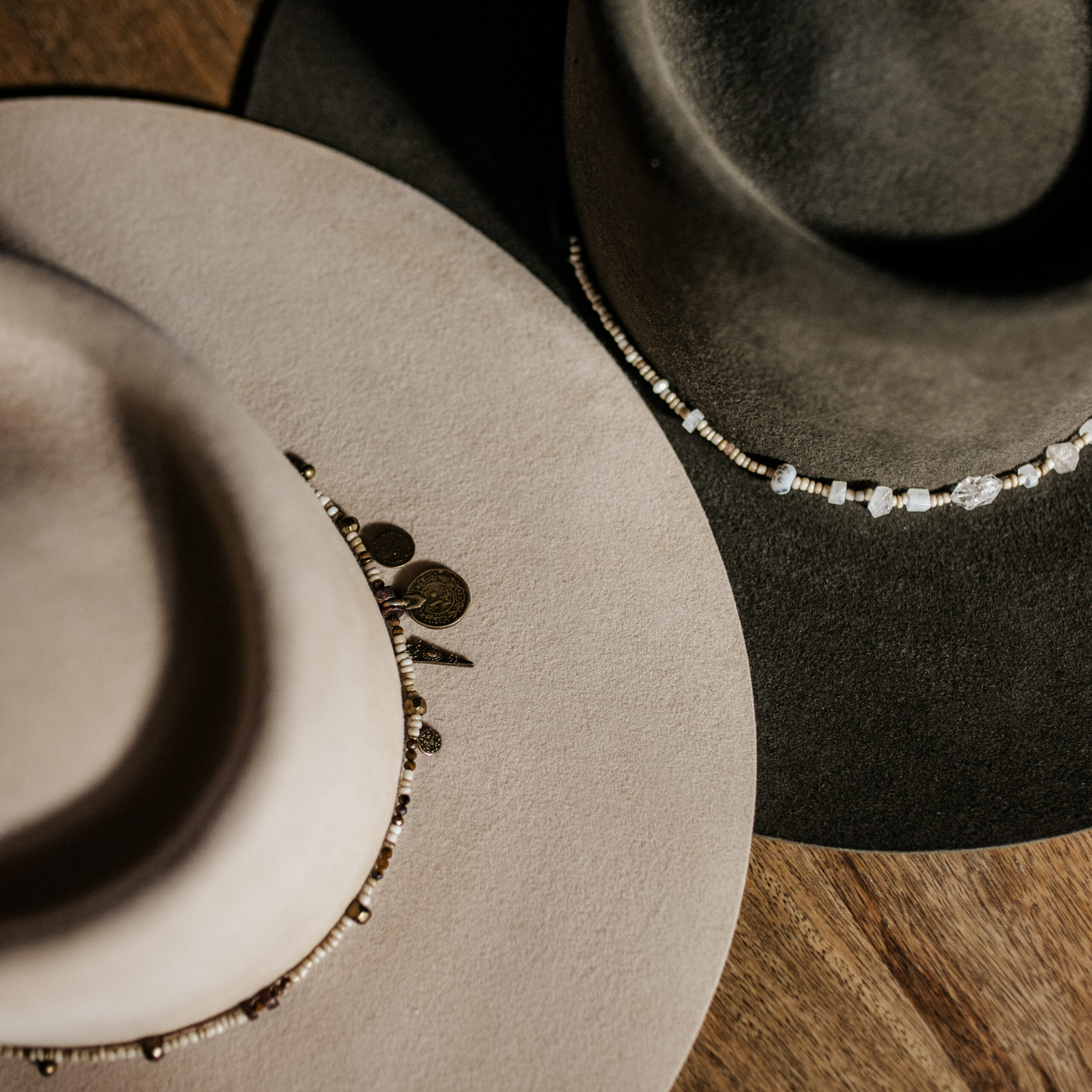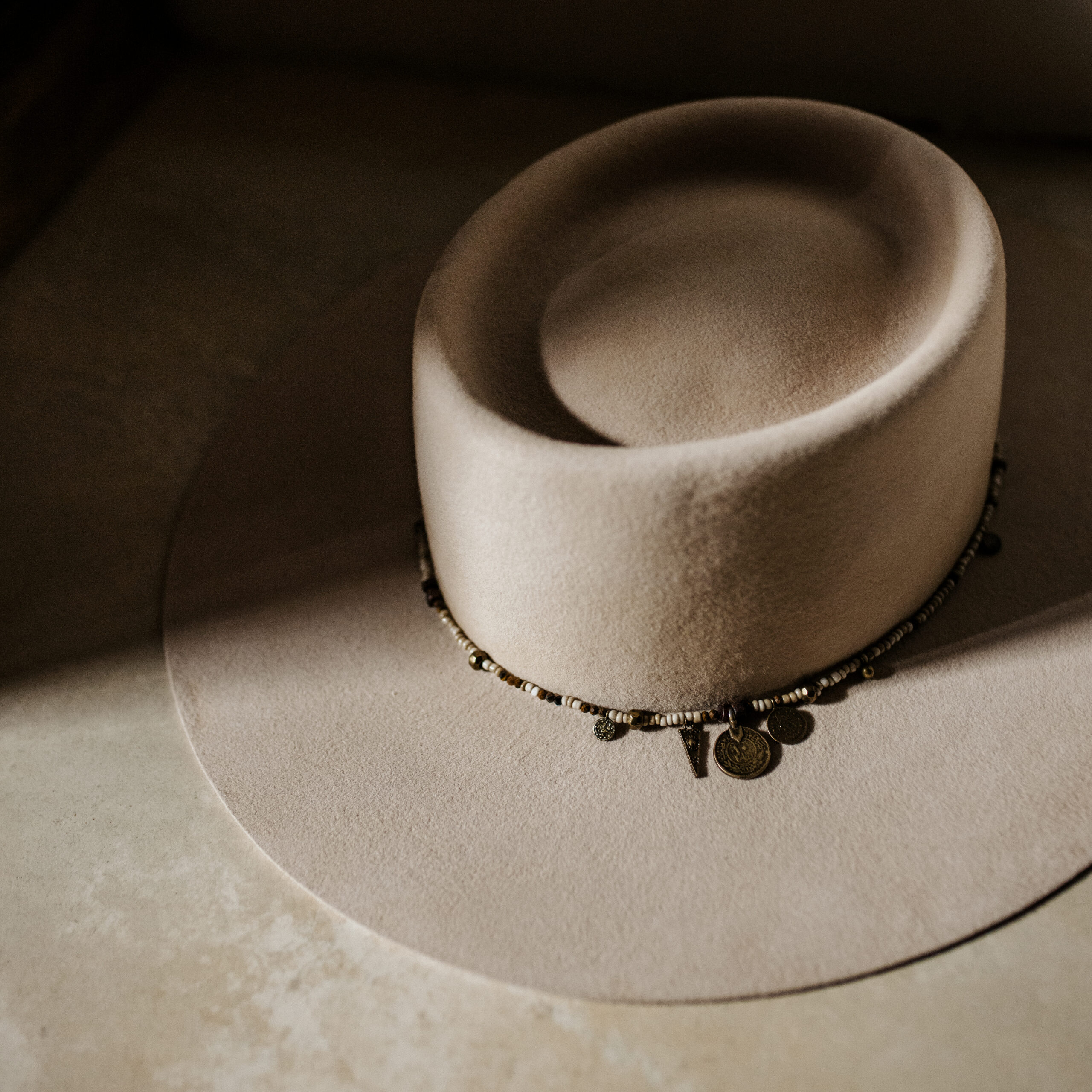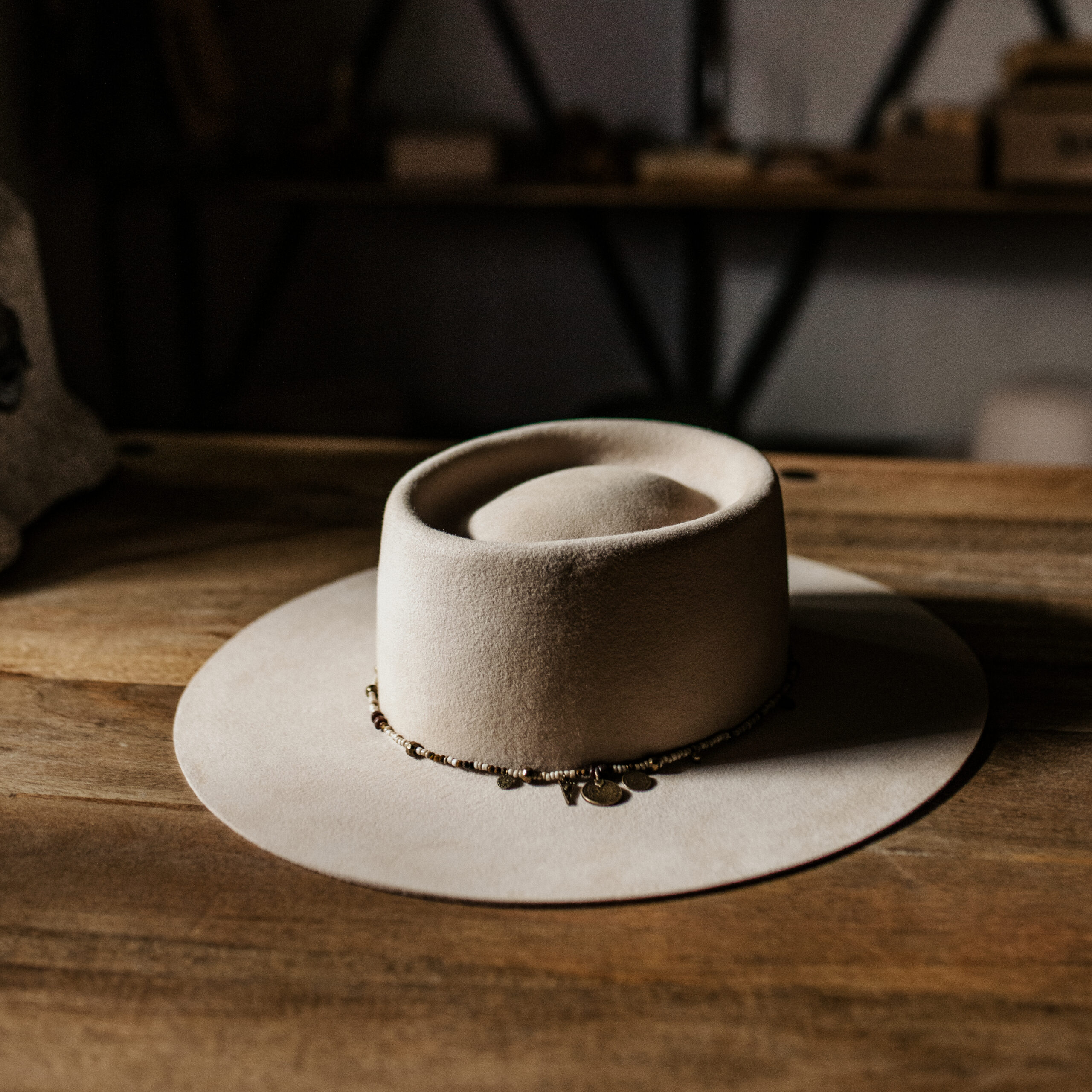 Crown of the Vagabond Hat on Mallorca in color Bone Oasis-shaped. Earthy coloured pearl-thread with little asymmetrical bronze highlights.