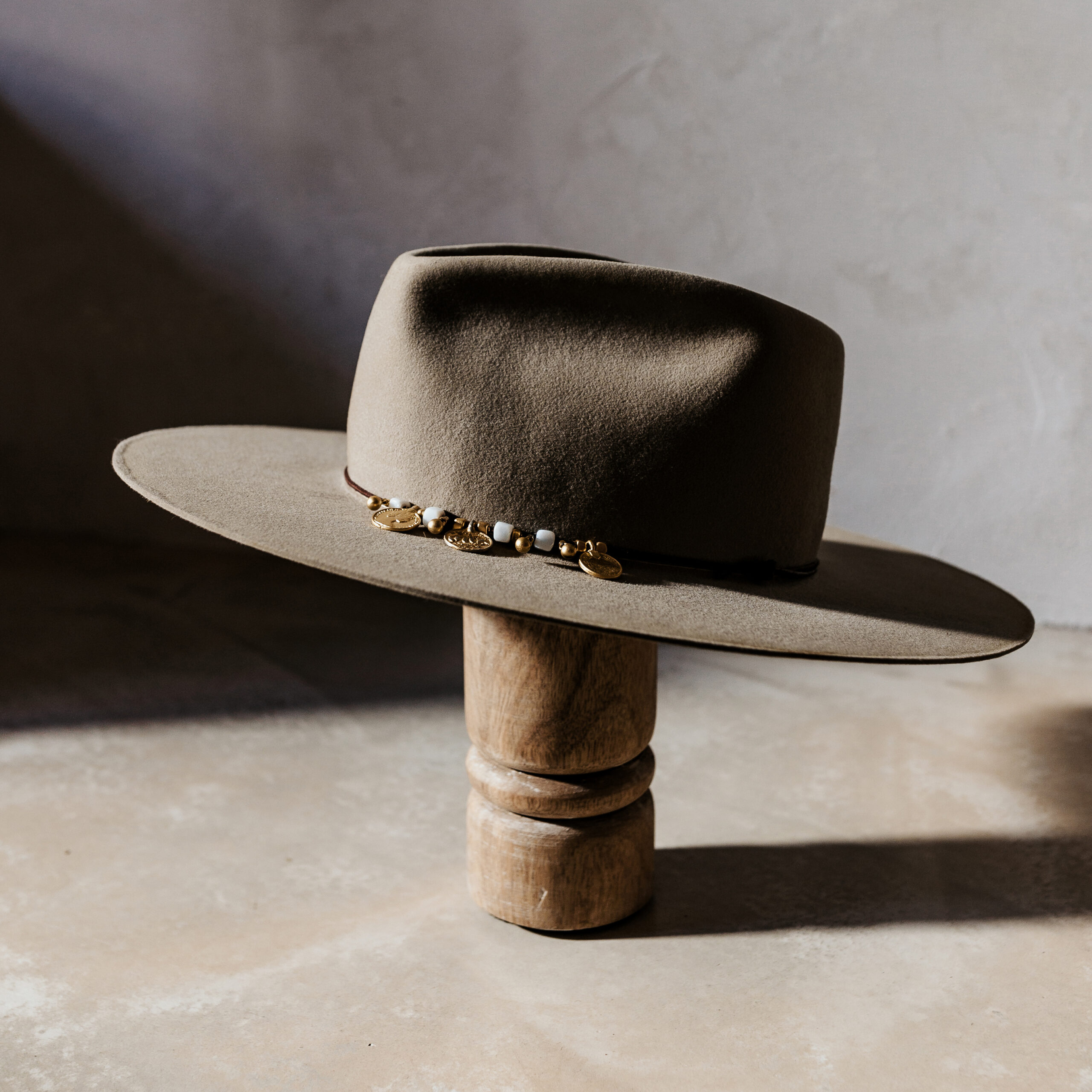 A beautifully handcrafted Crown of the Vagabond hat by the hatters Ruth and Chris on Mallorca with traditional tools in the color Prairie Dust and shaped in Gold Digger with an opulence look inspired by the antique and old ages consisting of a brown leather cord threading golden coins as well as golden other small golden elements and white formed stones with a flat brim - branded with the serial number 8.